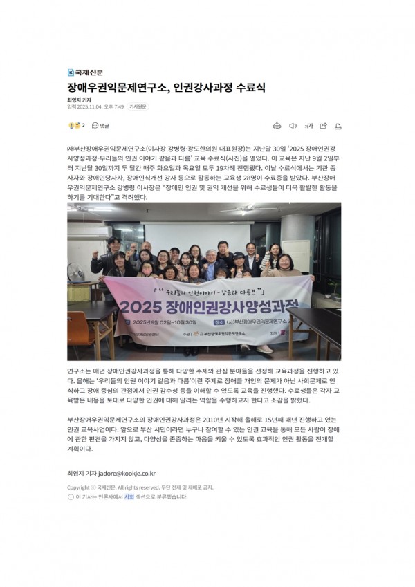 주소 : (48924) 부산광역시 중구 중앙대로 131,센트럴오피스텔 1404호 전화 : 051-465-4483 팩스 : 051-442-0883 이메일 : cowalkbs@hanmail.net Copyrightⓒ 2016 부산장애우권익문제연구소 All Rights Reserved. Supported by 푸른아이티.